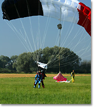Die Ausrüstung besteht aus einem speziell für Tandemsprünge gebauten Gurtzeug & Schirm, der uns auch sicher zur Erde bringt.